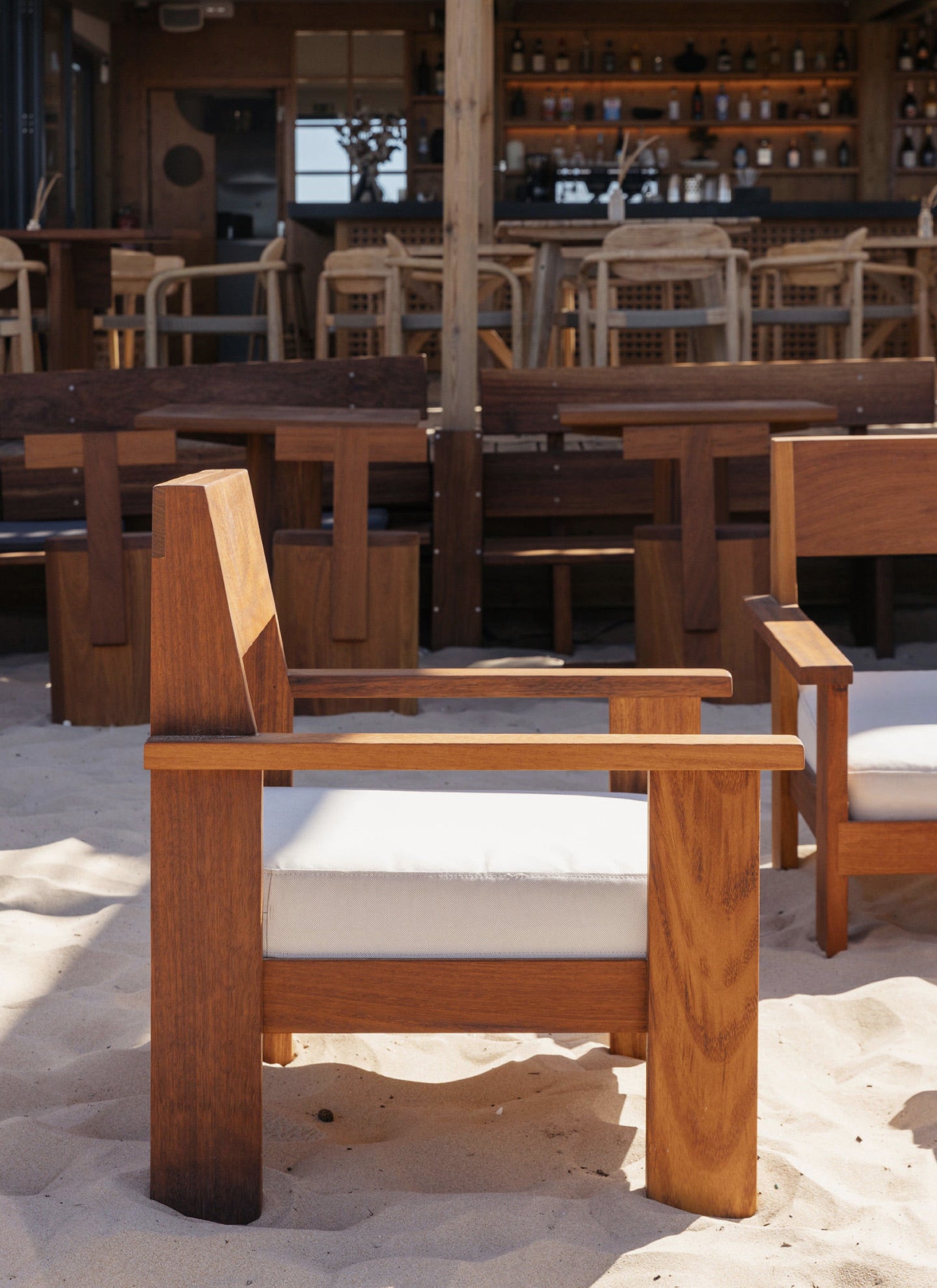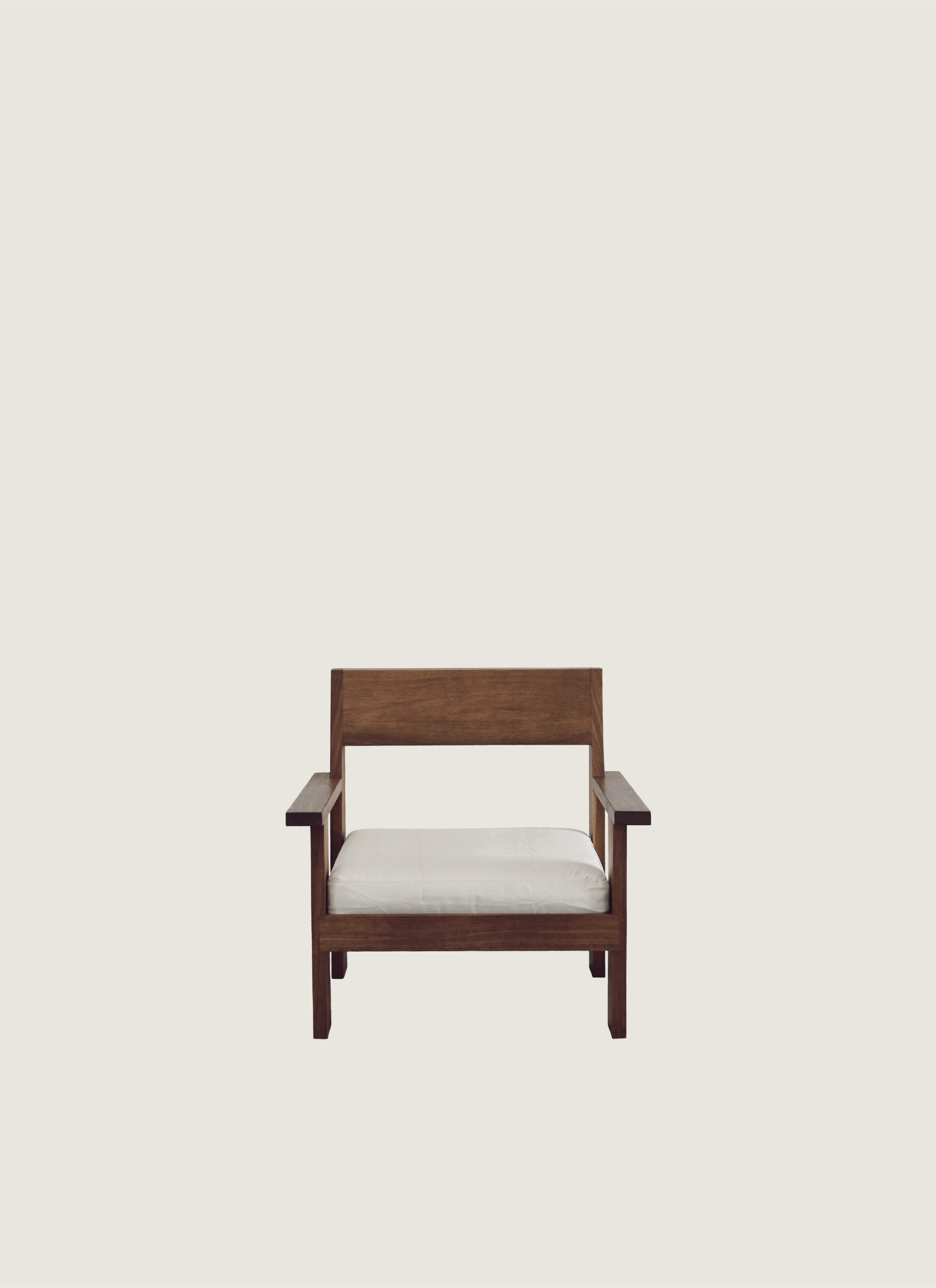 The Alba Lounge Chair features a solid wood frame with clean lines and a balanced, architectural form. Designed for outdoor use, it combines structure and comfort through its wide arms and simple upholstered seat. A versatile piece that fits seamlessly into different environments.