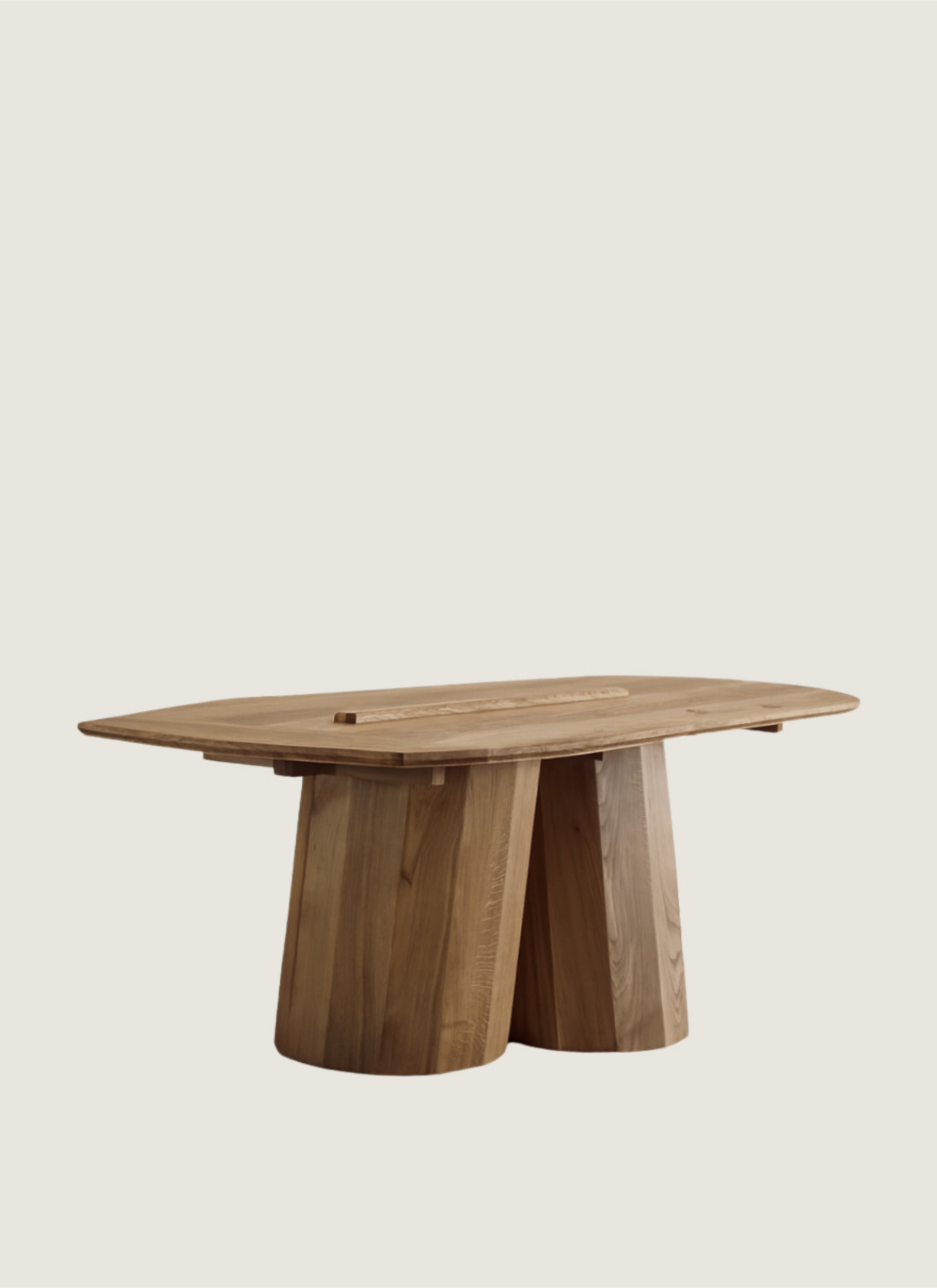 The Palma Table reimagines the dining table as a work of form and tension. Built in French oak, its cylindrical legs cross at angles to ground an asymmetrical top. A raised surface detail breaks expectation, giving the piece a striking point of view. This is a one-of-a-kind edition, crafted once and never repeated. The Palma Table was featured in Novo Banco’s gallery, home to the award-winning photography collection that received international recognition at the Corporate Art Awards – “Mecenati of the XXI Century” in the European Parliament for its outstanding collection of 21st-century living artists.